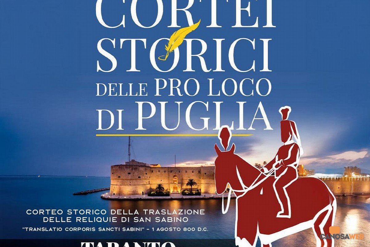 Canosa di Puglia sarà protagonista alla Rassegna dei Cortei Storici delle Pro Loco di Puglia, in calendario domenica 26 ottobre 2025 a Taranto, con la partecipazione della"Translatio Corporis Sancti Sabini", inserito nella mappatura nazionale delle rievocazioni storiche da parte del Ministero della Cultura grazie all'impegno dell'Amministrazione Comunale ed in particolar modo della consigliera Antonia Sinesi. Anche quest'anno, la Pro Loco di Canosa e la Cattedrale di San Sabino, in stretta sinergia con l'Ente Comunale, promuoveranno la presenza di questo evento identitario, profondamente radicato nella storia e nella devozione della comunità canosina. Ideato dal parroco don Felice Bacco, il Corteo Storico giunto alla XI edizione, rievoca con compostezza e autenticità la traslazione delle reliquie di San Sabino, patrono della città, avvenuta alla fine di luglio dell'anno 800 d.C.