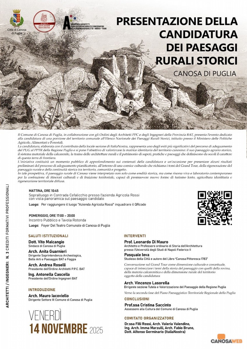Il Comune di Canosa di Puglia, in collaborazione con gli Ordini degli Architetti PPC e degli Ingegneri della Provincia BAT, presenta l'evento dedicato alla candidatura di una porzione del territorio comunale all'Elenco Nazionale dei Paesaggi Rurali Storici, istituito presso il Ministero delle Politiche Agricole, Alimentari e Forestali. L'appuntamento è fissato per venerdì 14 novembre e sarà articolato in due momenti distinti: la mattina, con sopralluogo presso "Masseria Rossi, il pomeriggio, presso il foyer del Teatro Comunale "Raffaele Lembo" dove si terrà un incontro pubblico e tavola rotonda. La candidatura, elaborata con il contributo della locale sezione di Italia Nostra, rappresenta uno degli esiti più significativi del percorso di adeguamento del PUG al PPTR della Regione Puglia e si pone l'obiettivo di valorizzare la matrice identitaria del territorio canosino: il suo paesaggio agrario storico, il sistema materiale della calcarenite, la trama delle architetture rurali e il patrimonio di saperi, pratiche e paesaggi che definiscono da secoli il carattere di questa terra di frontiera.