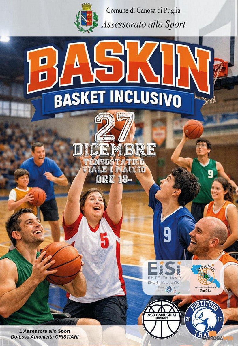 Cresce l'attesa per la prima manifestazione di basket inclusivo "Baskin", che si terrà sabato 27 dicembre 2025 a partire dalle ore 18:00, presso la tensostruttura comunale di Viale Primo Maggio, a Canosa di Puglia. Tra gli obiettivi dell'evento quello della promozione dell'inclusione sociale attraverso la pratica sportiva. L'iniziativa è promossa dall'Assessorato allo Sport, in collaborazione con l'Ente Italiano Sport Inclusivi, l'ASD Canusium Basket e la Fortitudo 2013 di Trani, realtà sportive da sempre attente ai valori educativi e sociali dello sport. «Il baskin – commenta l'Assessore allo Sport Antonella Cristiani – è una disciplina sportiva ispirata alla pallacanestro, nata con l'obiettivo di permettere a persone con differenti abilità fisiche, cognitive e motorie di giocare insieme nella stessa squadra. Grazie a regolamenti specifici, ruoli diversificati e a un'organizzazione inclusiva del gioco, il baskin consente a ciascun partecipante di contribuire in modo significativo alla performance collettiva, promuovendo valori fondamentali come l'integrazione, le pari opportunità, il benessere psicofisico e la cooperazione. È uno strumento concreto per diffondere uno sport realmente accessibile a tutti». L'Assessorato allo Sport ringrazia l'EISI sezione territoriale Puglia, l'ASD Canusium Basket e la Fortitudo 2013 di Trani per la preziosa collaborazione e per l'impegno profuso nella realizzazione di un evento che rappresenta un importante passo avanti nella promozione dello sport inclusivo sul territorio. Nel corso della serata sarà ricordata la memoria di Sabino Di Donato atleta e istruttore di minibasket .