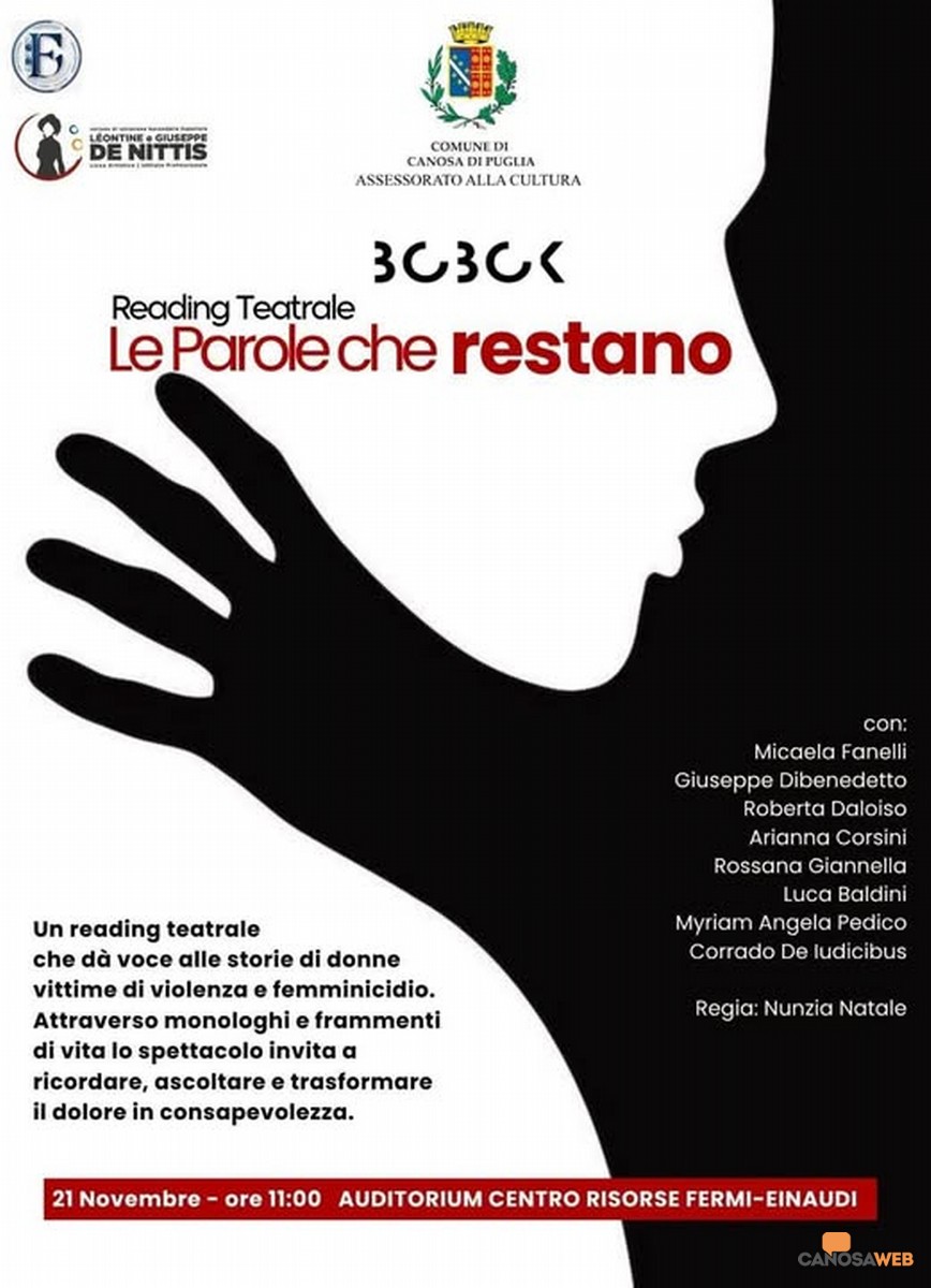 In occasione della Giornata internazionale contro la Violenza sulle Donne, venerdì 21 novembre, a partire dalle ore 11,00, si terrà un reading teatrale dal titolo "Le parole che restano", evento organizzato dall'Assessorato alla Cultura del Comune di Canosa di Puglia e dedicato agli studenti delle Scuole Superiori di II grado che avrà luogo presso l'Auditorium Centro Risorse dell'IISS "Fermi-Einaudi". La Compagnia Teatrale Bobok, diretta da Nunzia Natale, proporrà un reading teatrale dedicato alla riflessione sulla violenza di genere e sull'urgenza di promuovere una cultura del rispetto, della consapevolezza e della parità. La manifestazione, organizzata in collaborazione con l'IISS "Fermi-Einaudi" e l'IISS "Leontine e Giuseppe De Nittis" vedrà impegnati nello spettacolo dieci interpreti della compagnia che attraverso una sequenza di monologhi, dialoghi e testimonianze evocative, daranno voce alle tante storie di donne che hanno vissuto, subito o affrontato la violenza in tutte le sue forme. Le parole, intense e profonde, si intrecceranno con la musica eseguita dal vivo da Andrea Messina, che con i suoi interventi sonori accompagnerà e amplificherà le emozioni, creando un tessuto narrativo e sensoriale di grande impatto. L'iniziativa nasce dal desiderio di trasformare il teatro in uno spazio di ascolto, empatia e impegno civile, dove l'arte diventa strumento di denuncia, memoria e speranza. Un appuntamento che invita a fermarsi, a riflettere e a condividere un messaggio forte e universale: dire no alla violenza e sì alla libertà, alla dignità e alla vita di ogni donna.