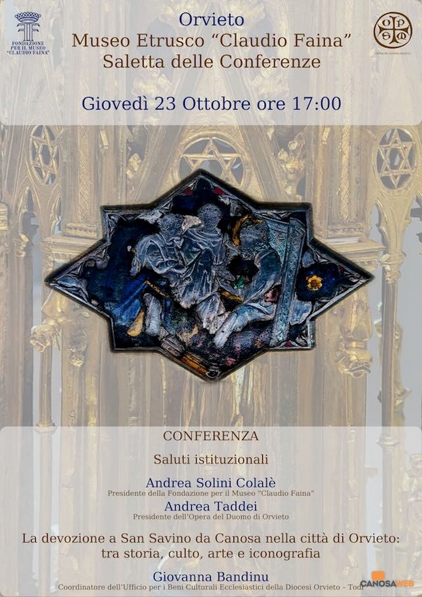 Sarà la Saletta delle Conferenze del Museo Etrusco "Claudio Faina" di Orvieto ad ospitare una conferenza pubblica "La devozione a San Savino da Canosa nella città di Orvieto, tra storia, culto e iconografia" che si terrà a partire dalle ore 17,00 di giovedì 23 ottobre nella città umbra. E' promossa ed organizzata dalla Fondazione per il Museo "Claudio Faina" in collaborazione con l'Opera del Duomo di Orvieto. Canosa di Puglia e Orvieto sono legate dalla devozione per San Sabino per la presenza di documenti, reliquie e testimonianze iconografiche in entrambe le città che continuano ad organizzare convegni di alto profilo focalizzando l'attenzione sul culto da collegare anche ai monaci benedettini, in quanto San Savino fu contemporaneo e confidente di San Benedetto da Norcia che incontrava con una certa periodicità a Montecassino, come racconta Papa San Gregorio Magno, suo primo biografo. Ad Orvieto per i saluti istituzionali annunciati gli interventi dell'avvocato Andrea Solini Colalè, presidente della Fondazione per il Museo "Claudio Faina", e dell'ingegnere Andrea Taddei, presidente dell'Opera del Duomo; mentre, la dottoressa Giovanna Bandinu, coordinatrice dell'Ufficio per i Beni Ecclesiastici della Diocesi di Orvieto-Todi illustrerà il legame tra il Santo e la città di Orvieto, dove era venerato nella Chiesa di San Giovenale. Approfondimenti inoltre sul Reliquario del Cranio di San Savino, "capolavoro indiscusso dell'oreficeria trecentesca", realizzato intorno al 1340-1345 da Ugolino di Vieri e Viva di Lando. L'opera, conservata nel Museo dell'Opera del Duomo e proveniente dalla Chiesa di San Giovenale, è attualmente esposta nella mostra "Grandi Maestri dal Museo dell'Opera del Duomo di Orvieto. Da Simone Martini a Luca Signorelli" in corso al Museo Etrusco "Claudio Faina". La dottoressa Giovanna Bandinu è stata relatrice alla conferenza sulla "Devozione a San Sabino nella Città di Orvieto tra storia, arte e iconografia" tenutasi Il 30 luglio scorso nella Cattedrale di San Sabino a Canosa di Puglia nell'ambito degli eventi culturali per la festa patronale molto sentita e partecipata.