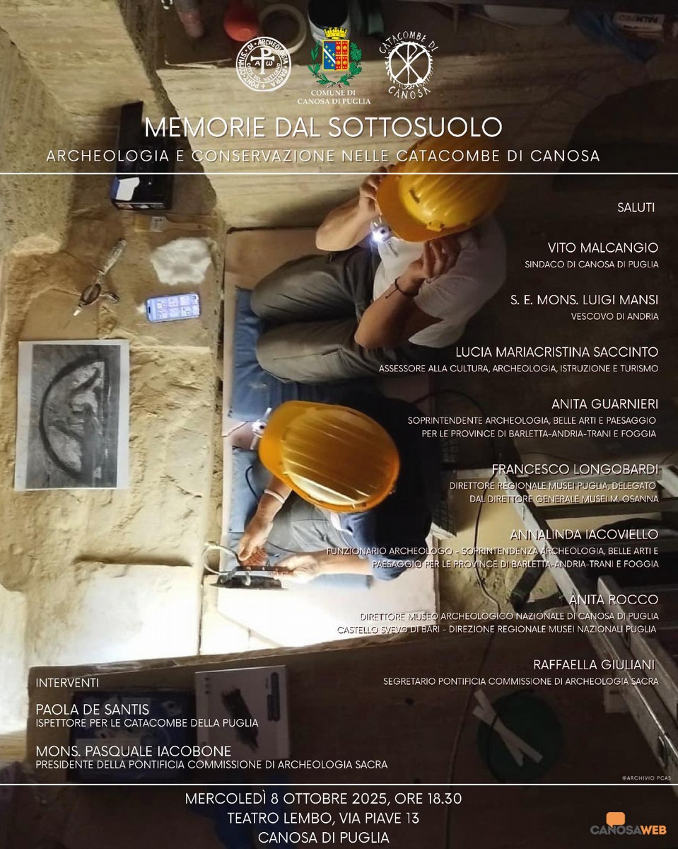 Gli interventi condotti dalla Pontificia Commissione di Archeologia Sacra a Canosa dal 2016, con programmatica sistematicità e senza soluzione di continuità, sono finalizzati a rendere, in futuro, gradualmente fruibile al pubblico il complesso catacombale con l'auspicio che, in sinergia con gli Enti e le Istituzioni preposte, si possa procedere al risanamento dell'intero sito archeologico interessato dalla presenza, oltre che delle catacombe paleocristiane, di una necropoli 'ad aperto cielo' di età romana (I sec. a.C.-metà VI sec. d.C.). Infatti, per consentire un reale e concreto processo di valorizzazione dell'intero sito archeologico da cui le catacombe non possono essere scorporate, è necessario affrontare e risolvere le fragilità e le problematiche conservative che lo affliggono da molti anni. Si tratta dell'unica strada possibile per restituire alla città, e a chi vorrà visitarla, un segmento importante della sua storia. L'8 ottobre alle ore 18:30, in collaborazione con il Comune di Canosa di Puglia, si svolgerà, presso il Teatro Comunale "Raffaele Lembo", l'incontro aperto al pubblico: "Memorie dal sottosuolo. Archeologia e conservazione nelle Catacombe di Canosa".