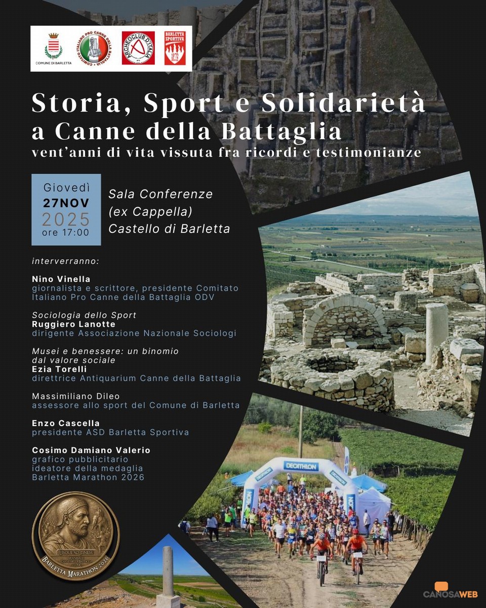 A Barletta, alle ore 17,00 di giovedì 27 novembre si terrà l'incontro pubblico dal titolo "Storia, Sport e Solidarietà a Canne della Battaglia. Vent'anni di vita vissuta fra ricordi e testimonianze" che avrà luogo presso la Sala Conferenze Ex Cappella del Castello E' promosso ed organizzato dal Comitato Italiano Pro Canne della Battaglia ODV in collaborazione con ASD Barletta Sportiva. Annunciati i relatori: saluto introduttivo del giornalista e scrittore Nino Vinella, Presidente del Comitato Italiano Pro Canne della Battaglia ODV ; Avv. Massimiliano Dileo, Assessore allo Sport e Pubblica Istruzione; Enzo Cascella, Presidente ASD Barletta Sportiva; Dott.ssa Ezia Torelli, Direttrice Antiquarium Canne della Battaglia "Musei e benessere: un binomio dal valore sociale" ; Dott. Ruggiero Lanotte, Dirigente Associazione Nazionale Sociologi "Sociologia dello Sport" ; Cosimo Damiano Valerio, grafico pubblicitario ideatore della medaglia Barletta Marathon 2026 . Sarà proiettata un'ampia galleria fotografica e video con anticipazioni sulle presenze in campo internazionale dello Sport barlettano.