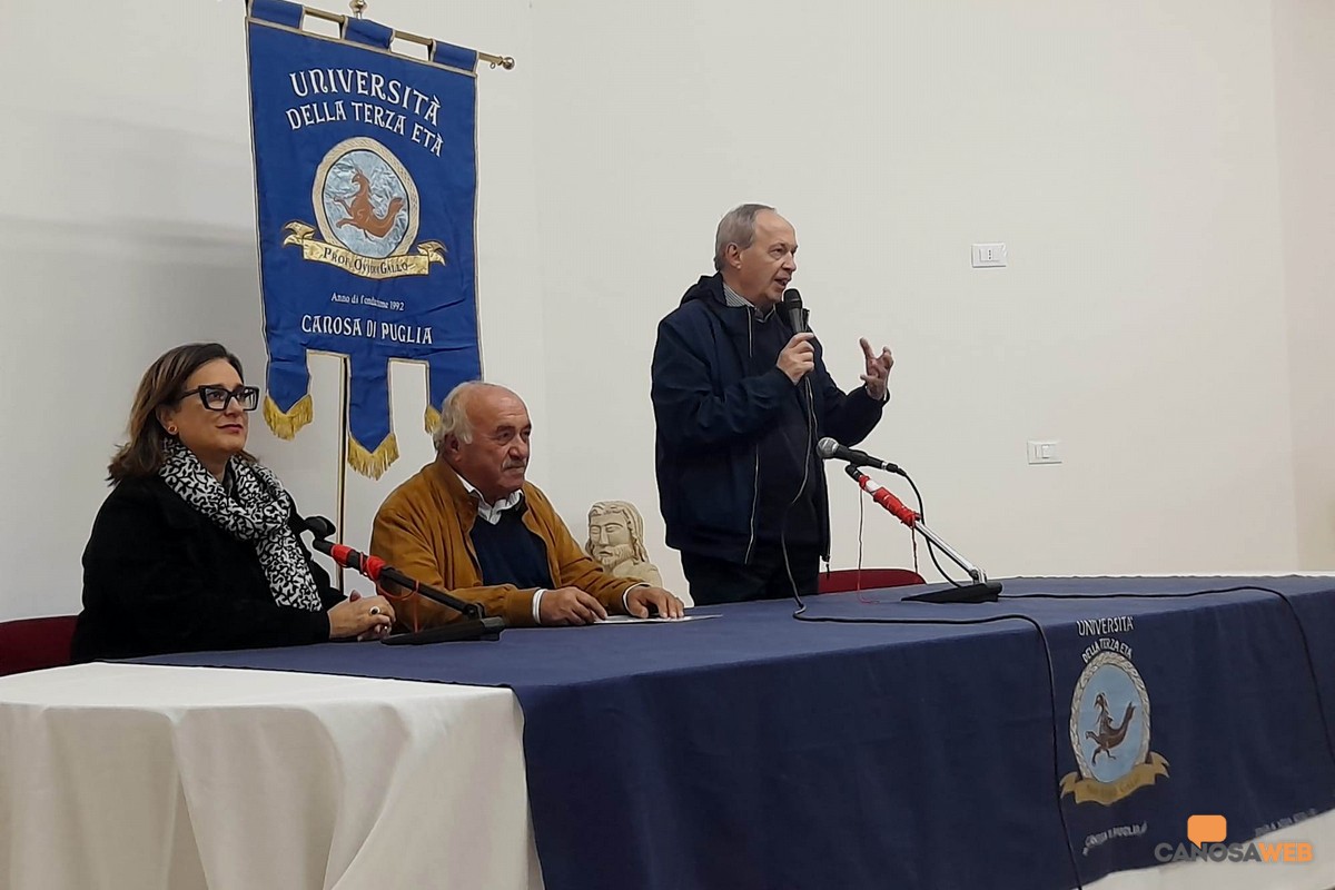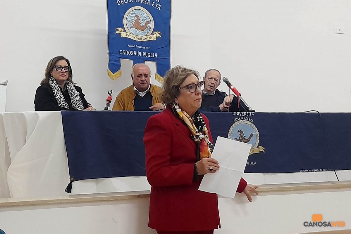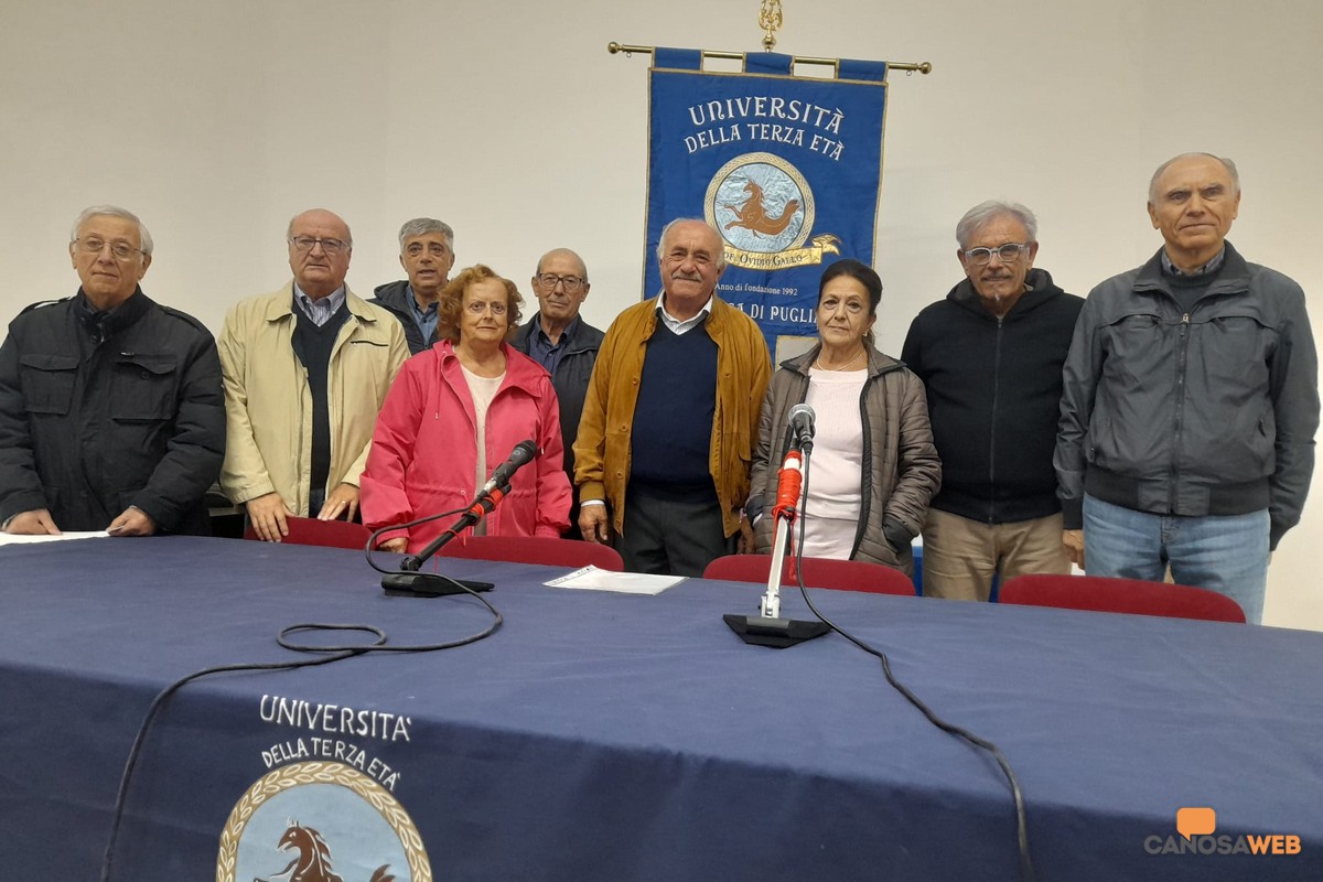 Emozioni a non finire nel corso della cerimonia di inaugurazione del 34° anno accademico 2025-2026 all'Università della Terza Età "Ovidio Gallo" di Canosa di Puglia, che si è svolta lo scorso 6 ottobre presso l'Auditorium dell'Oasi "Arcivescovo Francesco Minerva". E' stata aperta dal dottor Antonio Cioci, neo presidente che succede al dottor Sabino Trotta alla presenza delle autorità cittadine tra le quali: il vice sindaco di Canosa, Fedele Lovino; l'assessore alla cultura, Cristina Saccinto; il parroco della Cattedrale, Mons Felice Bacco che hanno speso parole di elogio e riconoscenza all'Università della Terza Età di Canosa di Puglia che promuove e realizza programmi socio-culturali per il territorio. Lunghi applausi durante l'abbraccio tra il past president e il nuovo, con la consegna di una targa a nome di tutti soci UTE che ringraziano il dottor Sabino Trotta che "in qualità di presidente con competenza, amorevole impegno e certosino lavoro ha trasmesso dignità e gioia ai nostri anni, rendendo grande l'associazione nel segno della cultura e della socialità, bene prezioso da custodire .Con profonda stima, affetto e gratitudine".