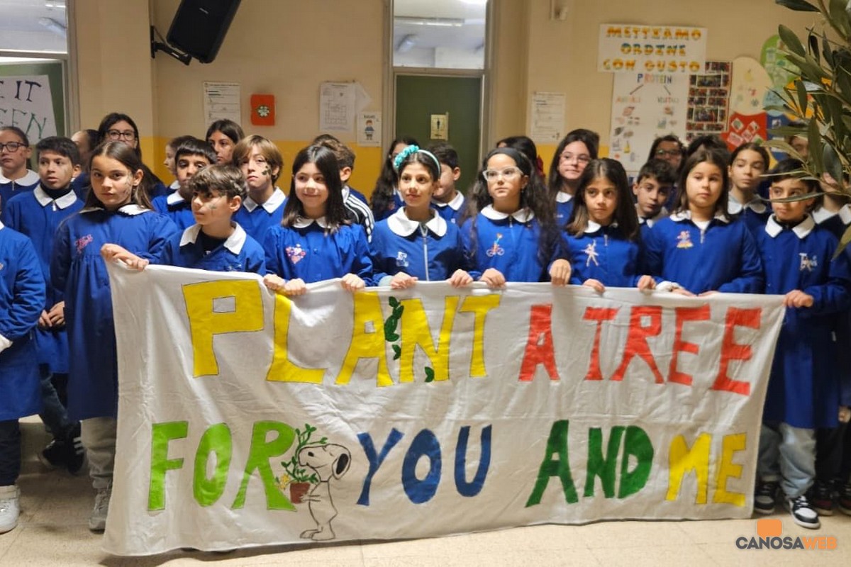 Molti lavori a tema sono stati portati a termine dagli alunni dell'IC "Lomanto-Foscolo-Mazzini" e dell'IC "Carella-Giovanni Paolo II-Bovio-Marconi " per la Giornata Nazionale degli Alberi che in Italia si celebra il 21 novembre di ogni anno. Tra gli obiettivi quello di promuovere la cura e la valorizzazione degli alberi e ricordare il ruolo essenziale dei boschi e del verde urbano per l'ecosistema dell'ambiente. "Gli alberi amano la musica", "Plant a tree for you and me" , tra gli striscioni esposti nella mattinata odierna per la Giornata Nazionale degli Alberi a Canosa di Puglia, dove il Comune in collaborazione con l'azienda "Caporalplant", ha inteso coinvolgere gli alunni dell'IC "Lomanto-Foscolo-Mazzini", e dell'IC "Carella-Giovanni Paolo II-Bovio-Marconi " per sensibilizzarli ad una tema di straordinaria importanza per l'uomo e l'ambiente stesso. L'Assessore alla Cultura Cristina Saccinto, unitamente all'Assessore al Verde Pubblico Saverio Di Nunno e alla consigliera comunale Mariangela Di Donato, hanno voluto condividere alcuni momenti della giornata con la comunità scolastica, affinchè "fin dalla tenera età anche i più piccoli comprendano l'importanza degli arbusti nella vita dell'uomo". Attraverso la collaborazione di un agronomo della "Caporalplant", si è provveduto a piantumare all'interno delle scuole alcuni alberi di ulivo, "ognuno dei quali sostiene la vita sul pianeta". A margine delle iniziative i rappresentanti del Comune intervenuti hanno scritto: "Si coglie l'occasione per ringraziare le dirigenti e le insegnanti per aver contribuito a questi momenti di riflessione" sulla Giornata Nazionale degli Alberi, istituita nel 2013, per promuovere la tutela del patrimonio arboreo e sensibilizzare i cittadini sull'importanza dello stesso per il clima, la biodiversità e la qualità dell'aria.