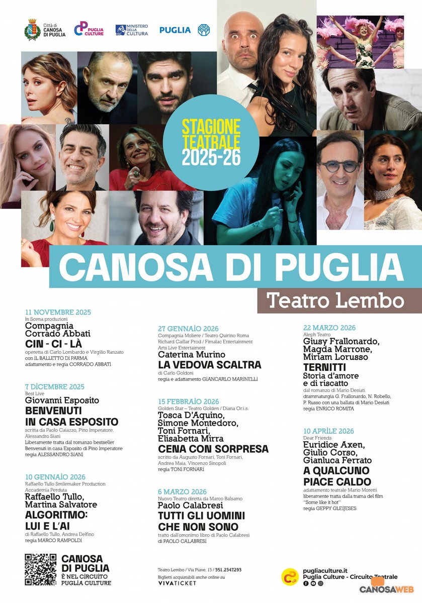 «La stagione teatrale 2025/26 del Teatro Lembo – spiega Sante Levante, Direttore di Puglia Culture - è il frutto di una collaborazione virtuosa tra il Comune di Canosa e Puglia Culture, nata con l'obiettivo di offrire al pubblico un'esperienza teatrale completa. Una stagione che intreccia tradizione e innovazione, emozione e pensiero, offrendo al pubblico un teatro vivo, popolare e di qualità, capace di raccontare la complessità del presente e la bellezza dell'incontro. Abbiamo costruito un cartellone che parla a tutte le generazioni, dai grandi nomi del teatro nazionale alle proposte pensate per i più giovani con La Scena dei Ragazzi. Il nostro impegno è quello di rendere il teatro un luogo vivo, accessibile e necessario, in cui le comunità possano riconoscersi e ritrovare, attraverso l'arte, un senso di appartenenza e di futuro».