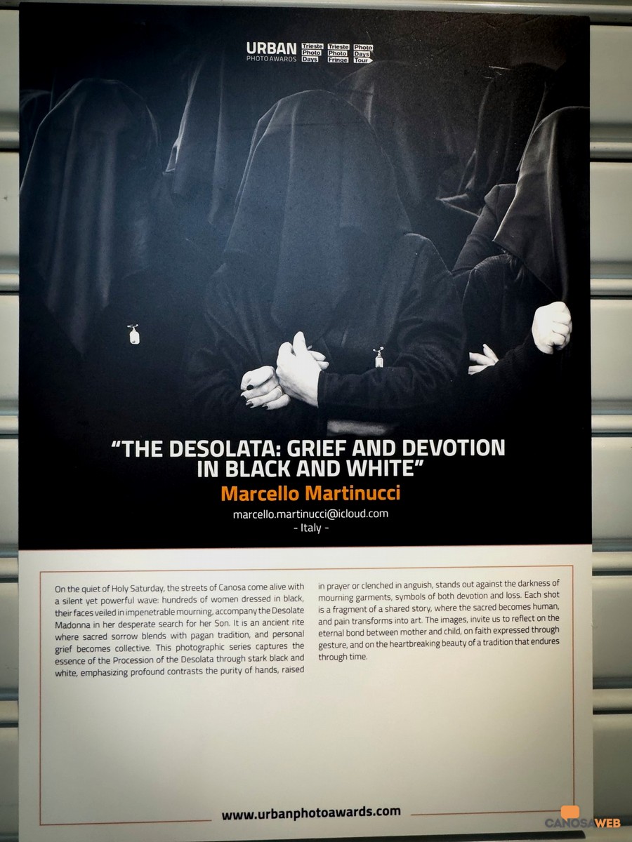 Le foto della Desolata sono in mostra a Trieste nell'ambito del "Trieste Photo Days", Festival Internazionale che espone oltre 2.000 opere in musei e sedi cittadine, con fotografi affermati ed emergenti. Le prime stime degli organizzatori riportano che nel 2025 sono stati raggiunti numeri record: 10.685 fotografie singole, 643 progetti & portfolio e 90 libri inviati da oltre 5.000 fotografi da tutto il mondo. Inaugurata l'8 ottobre la mostra intitolata "Fotografie Urbane: Trieste e le città nel mondo" sarà visitabile fino al 15 novembre 2025 presso la sede del Mercato Coperto in via Giosuè Carducci n.36. "The Desolata: Grief and Devotion in Black and White" annuncia il manifesto esposto a Trieste a cura di Marcello Martinucci che è stato per la prima volta a Canosa di Puglia, lo scorso 19 aprile, nella mattinata del sabato per assistere e fotografare la processione a conclusione dei riti della settimana pugliese. "La Desolata: Il Dolore e la Devozione in Bianco e Nero" il titolo del progetto in italiano con 9 fotografie esposte e scattate :"Nella quiete del Sabato Santo, le strade di Canosa di Puglia si animano di un'onda silenziosa e potente: centinaia di donne vestite di nero, veli impenetrabili sul volto, accompagnano la Madonna Desolata nella sua ricerca disperata del Figlio." Come riportano i dettagli della descrizione tradotta dall'inglese da Marcello Martinucci per il Festival Internazionale della Fotografia a Trieste: "È un rito antico, dove il dolore sacro si mescola alla tradizione, e il lutto individuale diventa corale. Questa serie fotografica cattura l'essenza della Processione della Desolata attraverso un bianco e nero che esalta contrasti profondi: il candore delle mani, levate in preghiera o strette in segno di sofferenza, risplende sul nero dei vestiti, simbolo di lutto e devozione. Ogni scatto è un frammento di un racconto collettivo, dove il sacro si fa umano e il dolore si trasforma in arte. Le immagini, ci invitano a riflettere sul legame eterno tra madre e figlio, sulla fede che diventa gesto, e sulla bellezza - conclude Martinucci - struggente di una tradizione che resiste al tempo."