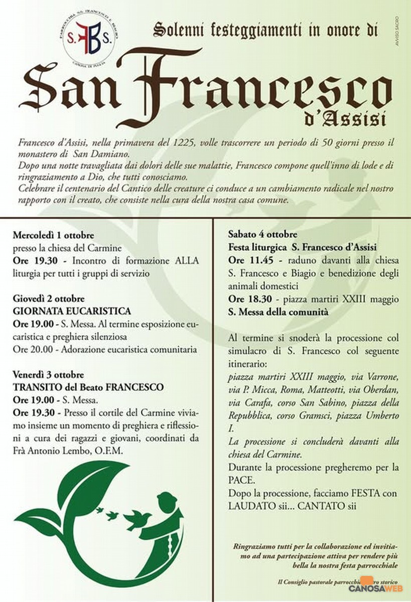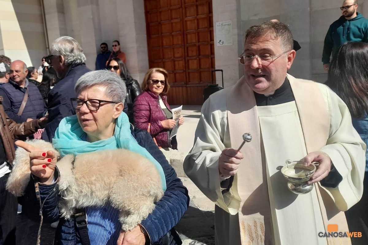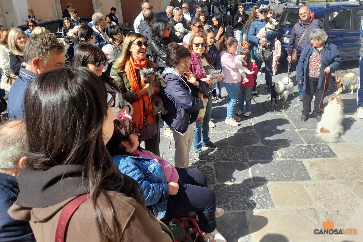 Il 4 ottobre si celebra la Giornata Mondiale degli animali che coincide con la festa del suo patrono San Francesco d'Assisi. Come da tradizione che si consolida, a Canosa di Puglia, si è tenuta la benedizione degli animali domestici. A mezzogiorno sotto il sole ottobrino, nel piazzale antistante della Chiesa dei Santi Francesco e Biagio, chiusa per restauro, il parroco Don Carmine Catalano ha benedetto i cani, tenuti al guinzaglio dai padroni e un paio di gatti in gabbia, attraverso momenti di preghiera per celebrare il rapporto tra gli esseri viventi che li ammaestrano ed al contempo sensibilizzare al rispetto degli animali di tutte le specie. Alla base del messaggio di San Francesco, c'è il senso di fraternità universale attraverso il quale il santo chiamava "fratelli e sorelle" protagonisti anche dei suoi racconti, in un invito a vedere la sacralità nella vita di tutti gli esseri viventi. La storia narra che la Giornata Mondiale degli Animali è stata istituita dall'attivista tedesco Heinrich Zimmermann nel 1925 proprio per sensibilizzare le persone sui temi legati al benessere degli stessi. Solo nel 1931, durante un congresso internazionale sulla protezione degli animali a Firenze, la Giornata Mondiale degli Animali ottenne un riconoscimento ufficiale con l'istituzione nella ricorrenza 4 ottobre. Quest'anno la Giornata Mondiale degli animali compie 100 anni, con la consapevolezza che gli stessi sono ormai riconosciuti come esseri senzienti, degni di rispetto e cure amorevoli.