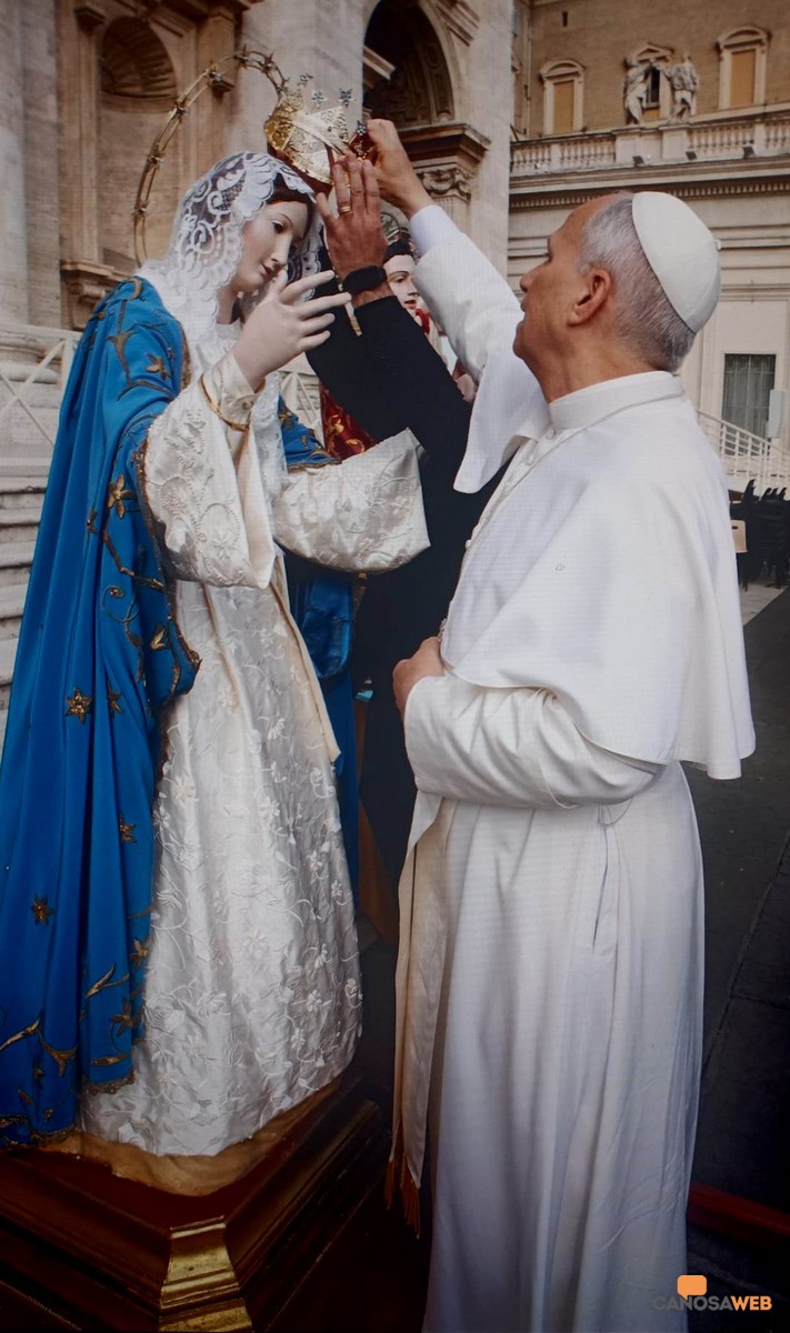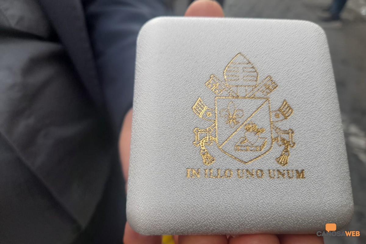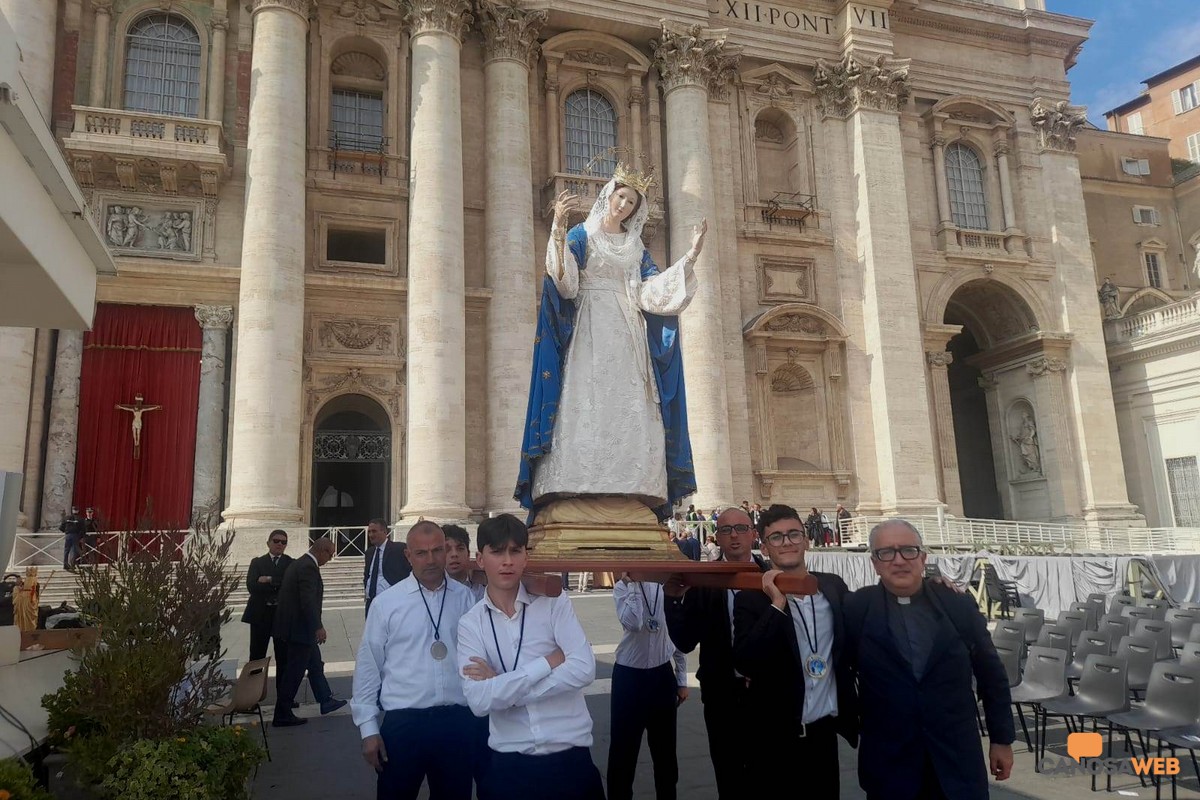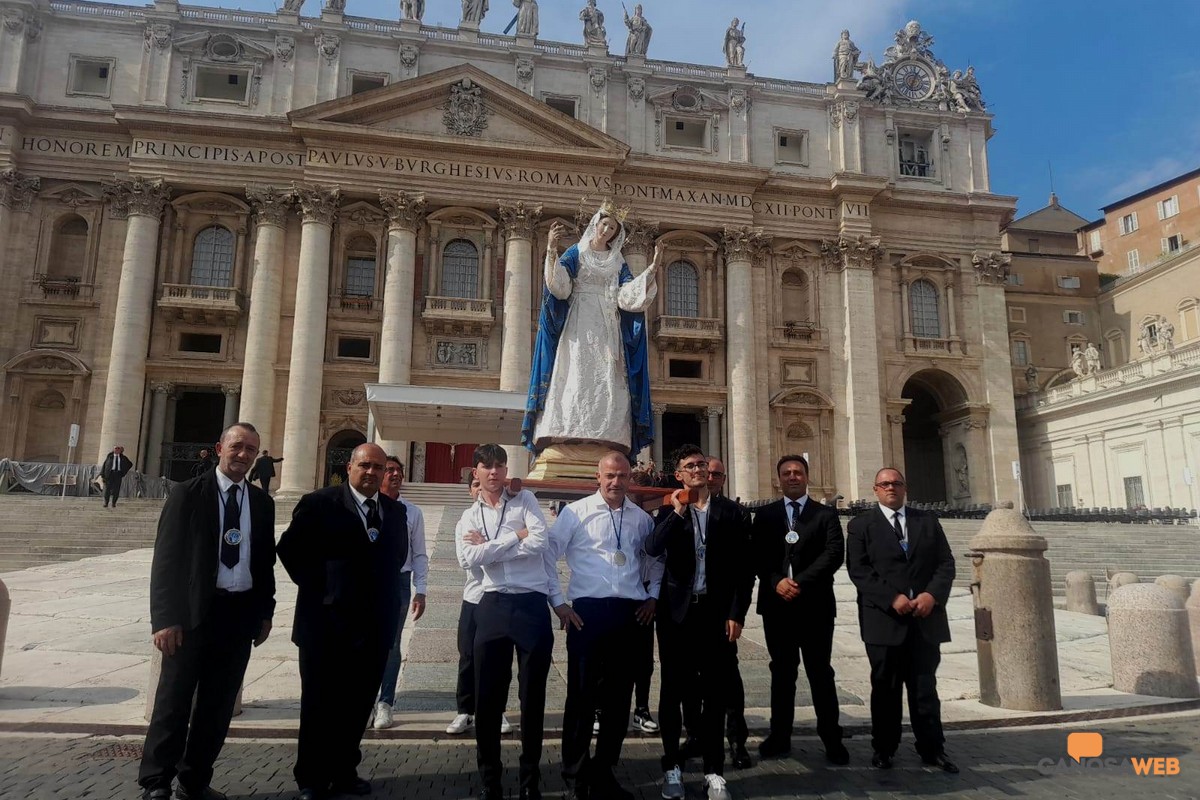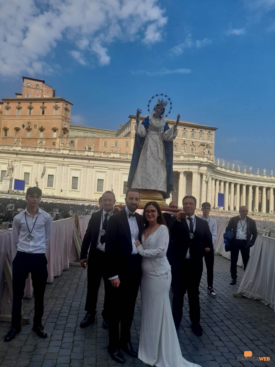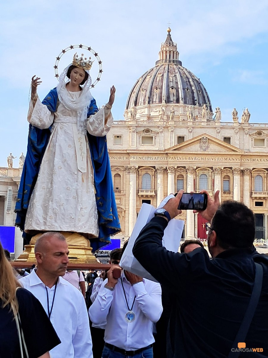 L'Udienza Generale in varie lingue si è conclusa con la recita in latino del Pater Noster, la Benedizione Apostolica, cui ha fatto seguito la benedizione particolare della corona posta sul capo della statua di Maria Assunta alla presenza del parroco Don Nicola Caputo che ha ricevuto in dono da Papa Leone XIV la corona del rosario. Al termine si è tenuta la processione posando i passi dei portatori a spalla e dei pellegrini sui sampietrini del Vaticano che accoglie le genti del mondo tra le braccia del Colonnato che costituisce il cuore della cristianità. La statua di Maria Assunta è stata portata presso la Chiesa di Santo Spirito in Sassia, il Santuario della Divina Misericordia, consacrato da Giovanni Paolo II nel 1994 come Centro della Spiritualità dove il parroco Don Nicola Caputo ha celebrato la santa messa di ringraziamento e affidamento a Maria "la più affettuosa delle Mamme che mai abbandona i suoi figli". (Spes non confundit, 24). In questo anno giubilare, la partecipazione del gruppo della comunità parrocchiale "Maria SS. Assunta" di Canosa di Puglia, accompagnando la statua per la benedizione all'udienza generale ha rappresentato non solo un incontro intenso di preghiera e fraternità ma anche occasione per sentirsi parte viva della Chiesa universale, attraverso gli insegnamenti diretti di Papa Leone XIV e unirsi spiritualmente a milioni di persone nel mondo che hanno ascoltato e meditato le sue parole in più lingue. Un'esperienza "unica e toccante" vivendo momenti di profonda spiritualità, fede e devozione a Maria SS. Assunta in cielo che quest'anno l'omonima comunità parrocchiale di Canosa di Puglia ha celebrato anche la benedizione del nuovo abito della Madonna con una corona di 12 stelle in ottone dorato con pietre celesti ad indicare la regalità di Maria, al suo ruolo di regina del cielo e della terra.