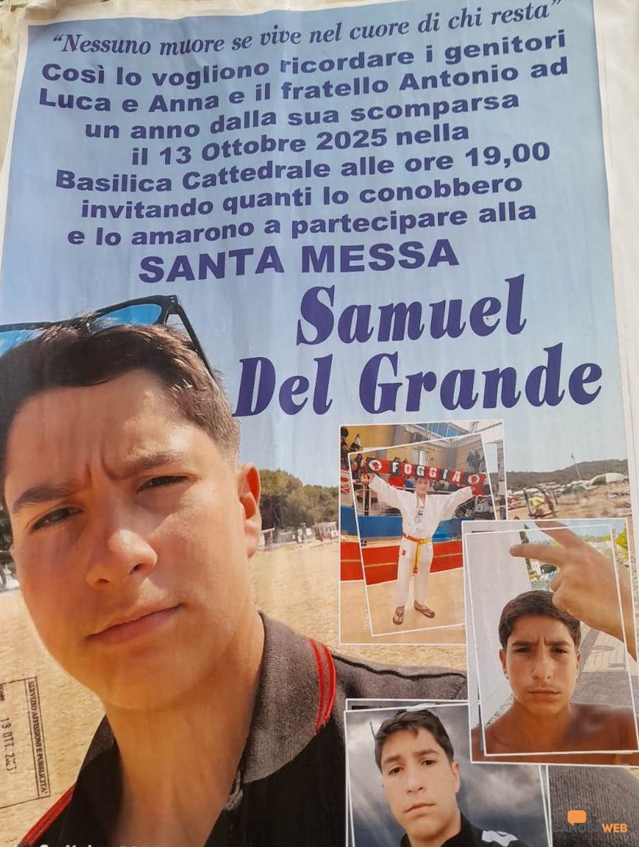 Con l'affissione dei manifesti nella Città di Canosa di Puglia è stato comunicato che nella Basilica Cattedrale di Foggia, alle ore 19,00 di lunedì 13 ottobre sarà celebrata una santa messa in suffragio di Samuel Del Grande, venuto a mancare all'età di 13 anni a causa di un incidente stradale. "Nessuno muore se vive nel cuore di chi resta" Così lo vogliono ricordare i genitori Luca e Anna, il fratello Antonio ad un anno dalla sua scomparsa, invitando quanti lo conobbero e lo amarono a partecipare alla celebrazione religiosa in sua memoria. Samuel Del Grande, studente del primo anno all'Istituto tecnico Da Vinci di Foggia (settore trasporti), tifoso del Foggia Calcio con la passione per il karate, è una delle tre vittime del tragico sinistro stradale accaduto nella tarda serata del 13 ottobre 2024, a pochi chilometri dall'uscita di Potenza Est, sulla Statale 93. Samuel Del Grande che era sulla stessa autovettura insieme a Gaetano Gentile (21 anni) e Michele Biccari (17anni), le altre due vittime dell'incidente, aveva assistito alla partita Potenza-Foggia e rientrava nel capoluogo dauno. Una tragedia che sconvolse non solo la comunità di Foggia ma tutto il mondo delle tifoserie italiane e che, generò un'impresa impensabile, facendo riabbracciare e unire fazioni rivali, cancellando l'odio nel segno dell'amore fraterno. in ricordo del compianto Samuel Del Grande, nel Parco Miranda, in Corso Roma a Foggia, è stata piantumata una quercia come simbolo di rinascita e di amore.