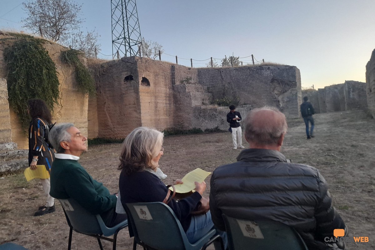 Un tramonto più estivo che autunnale ha fatto da cornice alla presentazione ufficiale del programma finale dal titolo "Rasoterra", svoltasi il 10 ottobre scorso, la prima delle due giornate nell'ambito della residenza artistica "In-ruins 2025" ambientata nei siti archeologici di Canosa di Puglia. In gergo calcistico "rasoterra" richiama il tiro effettuato in modo che la palla segua un percorso rasente al terreno di gioco, mentre, la residenza artistica "In-ruins 2025" narra della soglia in cui il tempo si schiaccia e l'eternità si contrae in un istante: l'attimo in cui si discende e si risale, in un continuo addivenire di colline, persone e rovine. In questa urbanità dissonante, incastrata tra cave e cantieri, hanno operato per un mese gli artisti in residenza, trasformando i loro sguardi in strumenti di scavo come la lente di ingrandimento alla scoperta delle bellezze canosine che hanno perfezionato con le loro mani e menti creative spingendosi oltre i limiti. Manualità e intelletto artistico per una creatività al di sopra dei soliti canoni, ripensando il territorio di "Principi, Imperatori e Vescovi". Siti e parchi archeologici di Canosa di Puglia che sono diventati "luoghi di incontro, capaci di accogliere pratiche urgenti e dialoghi interdisciplinari, nel cuore di contesti periferici."