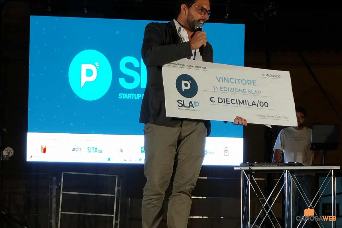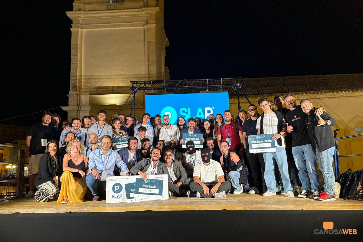 Buona la prima! Esordio positivo, propositivo e arricchente per tutti i partecipanti a SLAP – Startup Lanciate dAlla Puglia, l'evento che nei giorni 29 e 30 agosto 2025 ha focalizzato l'attenzione sull'innovazione e l'imprenditorialità ad ampio raggio. A Canosa di Puglia, sono giunti i rappresentanti delle startup emergenti, investitori, mentor, manager aziendali e rappresentanti delle istituzioni che hanno preso parte ad un evento attraverso un concept dinamico basato su pitch competition, talk ispirazionali, networking e contaminazione creativa. Grande merito e plauso agli organizzatori Marco Lenoci, Giandomenico Bucci e Nicola Sciannamea che hanno ideato e promosso "SLAP un acceleratore di visioni", finalizzato tra l'altro a valorizzare le idee ad alto potenziale Made in Italy, offrendo alle startup visibilità, contatti strategici e opportunità concrete di crescita e sviluppo. Nell'ambito del cartellone dell'Estate Canosina 2025, due location importanti come il Museo dei Vescovi e Piazza Vittorio Veneto sotto il campanile della Cattedrale di San Sabino hanno ospitato i protagonisti degli incontri programmati , dei talk e pitch delle startup, delle attività di networking e della cerimonia di premiazione delle startup finaliste.