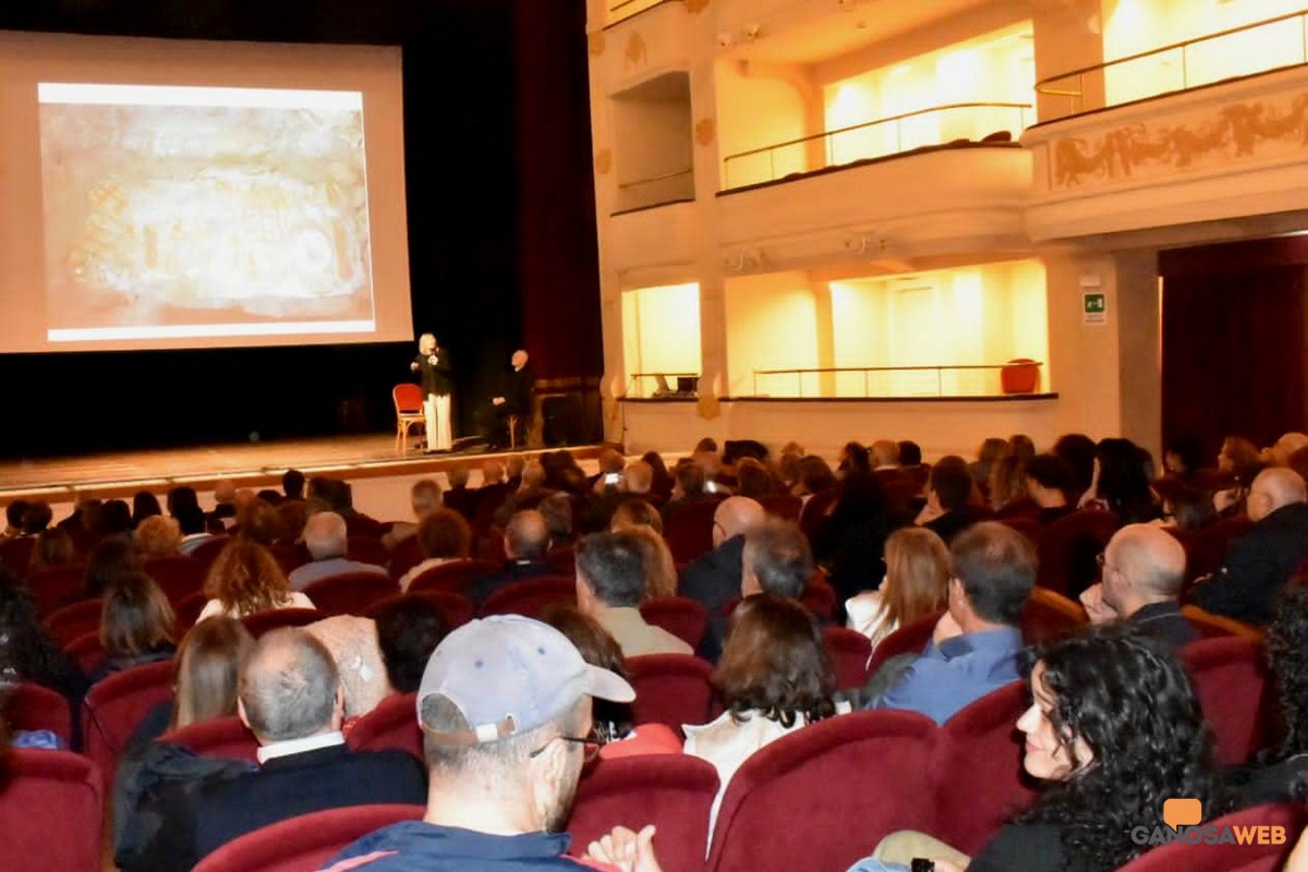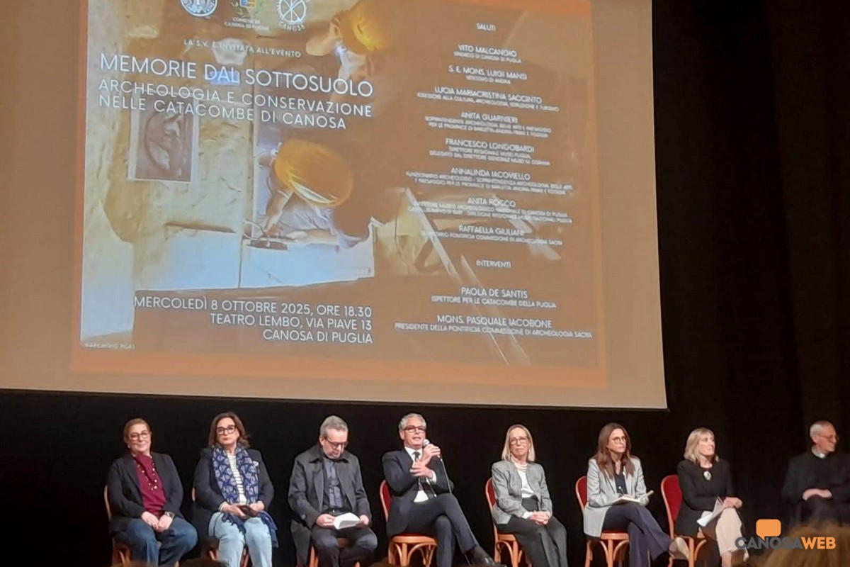 Una platea gremita per la presentazione delle "Memorie dal sottosuolo. Archeologia e conservazione nelle Catacombe di Canosa" che stasera ha avuto luogo presso il Teatro Comunale "Raffaele Lembo" di Canosa di Puglia. Il complesso catacombale tardoantico di Canosa (metà IV-metà VI secolo d.C.), sito in località Lamapopoli, all'esterno della città antica e in prossimità della via Traiana, è uno degli "esempi più evidenti dell'eccezionale compresenza di un patrimonio storico e archeologico di notevole valore unito a una potenziale ricchezza di tipo paesaggistico e naturalistico". L'unico di questo genere sull'intero territorio regionale che negli ultimi anni è stato al centro di conferenze, convegni nazionali e internazionali tenutisi a Pechino, Leiden, Belgrado, Roma, Napoli e Udine. La monografia scientifica intitolata : "Coemeteria Requirere I. Archeologia e conservazione nel complesso cimiteriale tardoantico di Lamapopoli a Canosa di Puglia: gli ipogei F, G, H (2016-2022)" – Pontificia Commissione di Archeologia Sacra Città del Vaticano 2023 - di Paola De Santis ha ricevuto il prestigioso Premio Cimitile 2024 incentrato sul valore della cultura quale fattore di sviluppo socio–economico anche attraverso la valorizzazione del patrimonio archeologico-cristiano a livello internazionale. Riflettori puntati sull'integrazione tra archeologia e conservazione per la valorizzazione dell' immane ricchezza presente in località Lamapopoli, evidenziando tra l'altro il concetto di "comunità di patrimonio", definito come "un insieme di persone che attribuisce valore ad aspetti specifici del patrimonio, e che desidera, nel quadro di un'azione pubblica, sostenerli e trasmetterli alle generazioni future".