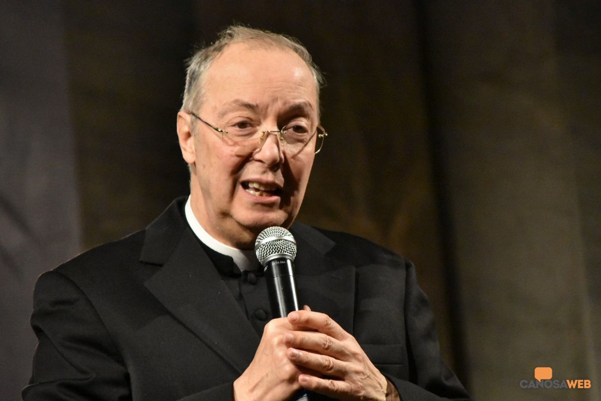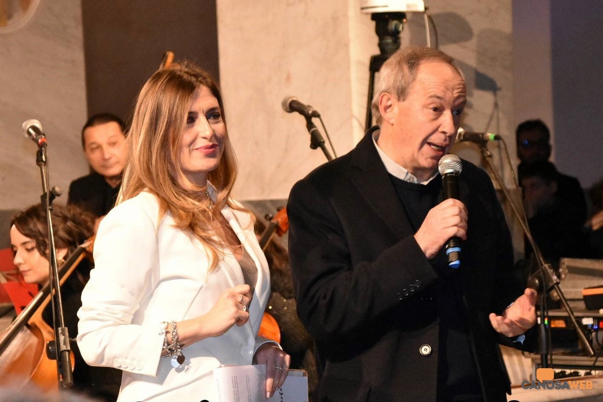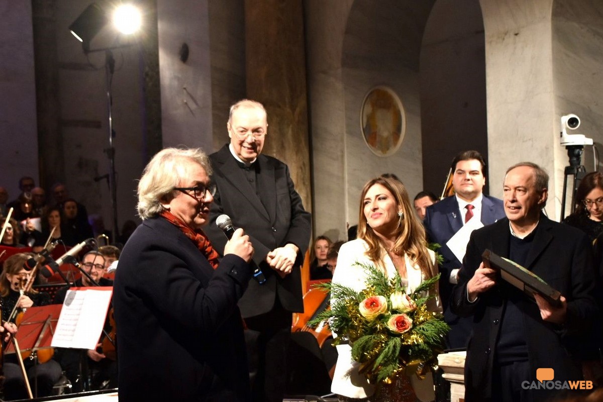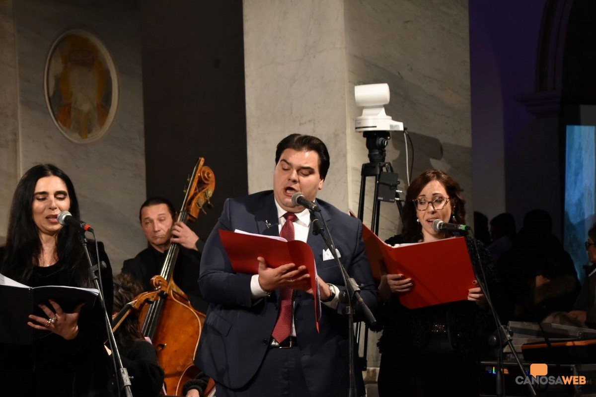Straordinaria direzione del Maestro Monsignor Marco Frisina al "Concerto di Natale in Basilica" che si è svolto la scorsa domenica 4 gennaio 2026 presso la Basilica Cattedrale S. Sabino di Canosa di Puglia. Applausi calorosi e ovazioni di gradimento per la XXIX Edizione del "Concerto di Natale in Basilica" che ha visto l'esibizione: della Corale Polifonica della Basilica ConCattedrale S. Sabino di Canosa; della Corale Polifonica "Michele Cantatore" di Ruvo di Puglia; dell'Orchestra Sinfonica Nuovi Spazi Sonori; di Angela Bonfitto (Mezzosoprano); di Maria Rosaria Catalano(Mezzosoprano) e Nico Franchini (Tenore) sotto la magistrale bacchetta di Mons.Marco Frisina, famoso autore e compositore. Un repertorio d'eccezione che ha incantato il pubblico attraverso un viaggio musicale con brani italiani ed internazionali, tra i più celebri della tradizione natalizia, introdotti dalle riflessioni di Mons. Marco Frisina, in condivisione di valori e insegnamenti. "E attraverso la musica si può direttamente arrivare al cuore. Noi musicisti avremmo questo dovere: annunciare il Vangelo a modo nostro. Io ho una doppia vita: come biblista faccio gli esercizi spirituali, ma come musicista predico ugualmente. Nella mia esperienza come compositore ho visto che la musica comunica nello stesso modo anche in nazioni diverse." La presenza di Monsignor Marco Frisina è stato motivo di vanto all'interno di questa edizione come ha evidenziato Mons .Felice Bacco nel corso del serata alla presenza delle autorità cittadine e di un pubblico delle grandi occasioni che hanno espresso gratitudine e apprezzamento per il "Concerto di Natale in Basilica", veicolo di messaggi di speranza, di gioia, di pace, di fraternità. Dai tradizionali "Tu scendi dalle stelle" a "Fermarono i cieli" , "Jingle Bells", "Stille nacht" ai significativi "Preferisco il Paradiso", "Jesus is my life", tutti canti intesi come momenti comunitari essenziali e comunicativi. Grandi meriti al direttore artistico M° Salvatore Sica ed ai Maestri del Coro: Franco Sisti, Angelo Anselmi e Maria Rosaria Catalano, per l'impegno profuso nella preparazione ed organizzazione della XXIX Edizione del "Concerto di Natale in Basilica" presentato dalla giornalista Marilena Farinola e trasmesso su Tele Dehon, che ha rappresentato il momento clou della collaborazione di tutti gli artisti, professionisti e non, che si sono esibiti in un'atmosfera di bellezza, spiritualità, comunità e cultura musicale di valore e valori.