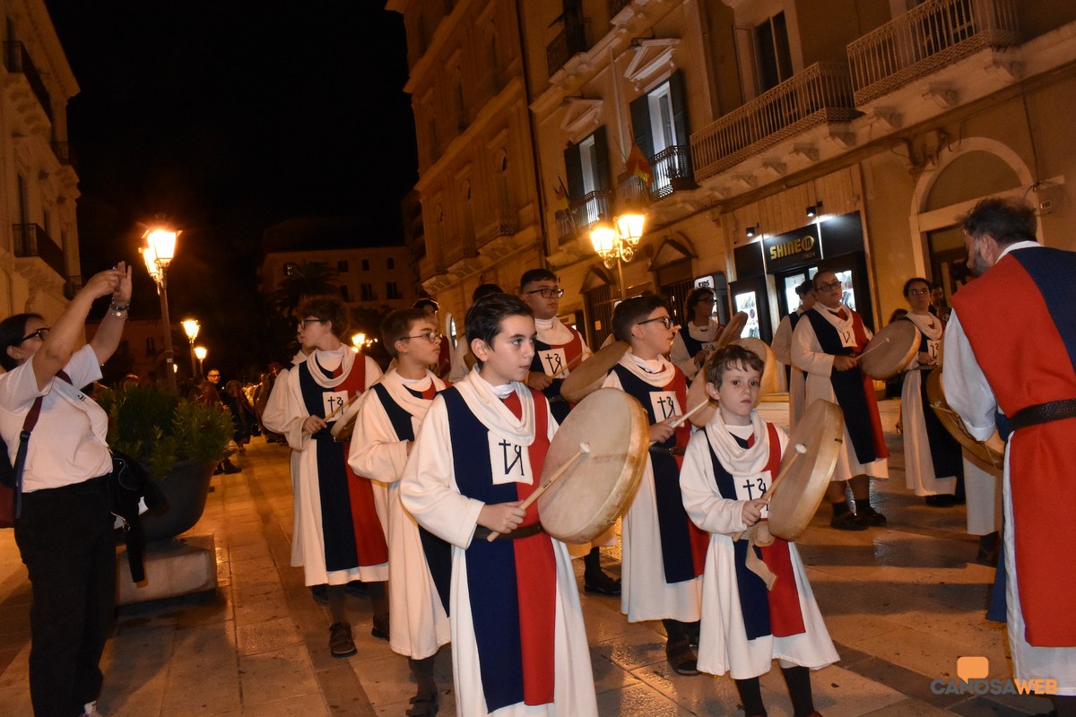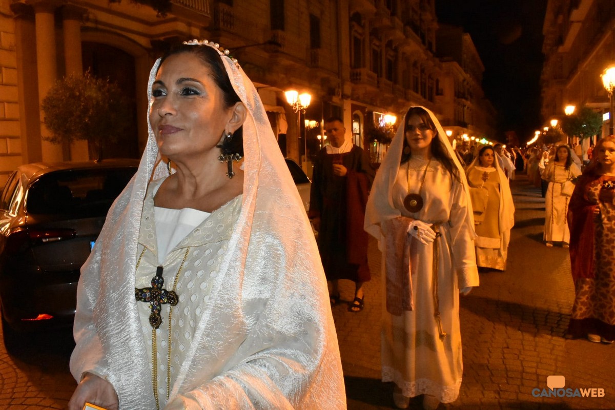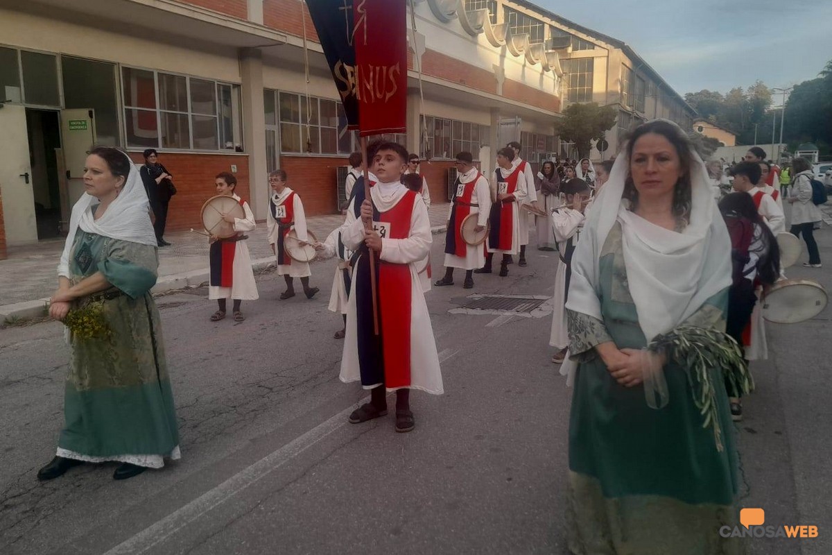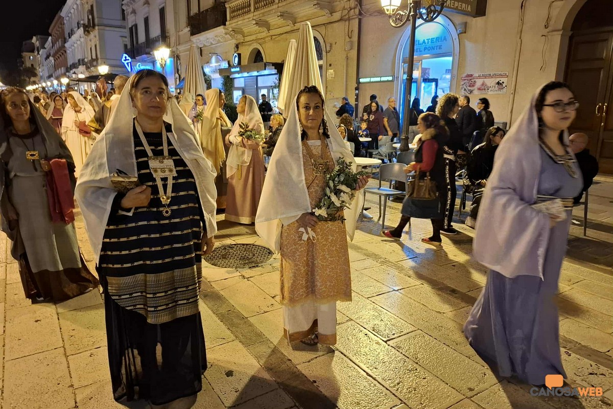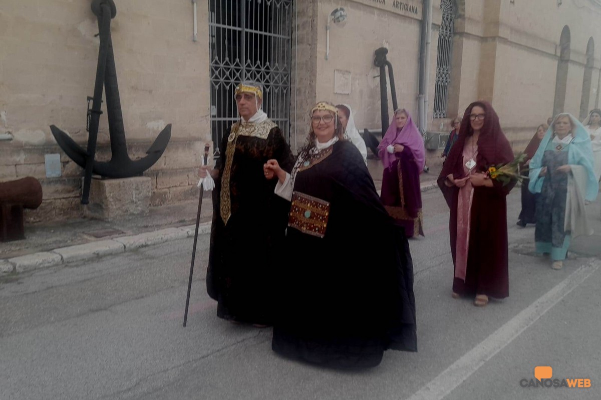 Oltre 1.200 figuranti hanno preso parte alla VII Edizione della Rassegna dei Cortei Storici delle Pro Loco di Puglia, andata in scena a Taranto nel tardo pomeriggio della scorsa domenica 26 ottobre. Per il terzo anno consecutivo, dopo Brindisi e Lucera, protagonista il Corteo "Translatio Corporis Sancti Sabini" di Canosa di Puglia, iscritto nella mappatura nazionale delle rievocazioni storiche del Ministero della Cultura e dell'lstituto Centrale per il Patrimonio Immateriale, l'unico della BAT, oltre ad essere stato il più numeroso con 105 figuranti, da 8 a 82 anni, tra i 19 cortei provenienti dalla Puglia e dalla Basilicata. I Cortei Storici, rappresentano l'identità culturale, le tradizioni, gli usi e i costumi, il folklore delle comunità. "Un viaggio nel tempo per riscoprire la forza delle nostre tradizioni" attraverso le rappresentazioni che rievocano eventi storici e religiosi della memoria dell'antico, costituendo un patrimonio immateriale della collettività per il loro legame con i luoghi del territorio e la grande forza di coinvolgimento della comunità di riferimento. Di grande impatto ritmico e visivo, il nuovo gruppo dei tamburellisti composto da ragazzi canosini da 8 ai 16 anni, diretto dal Maestro Attanasio Mazzone della Musikeria che ha scandito i tempi del corteo storico della traslazione delle reliquie di San Sabino, partendo dall'Arsenale della Marina Militare di Taranto e poi lungo le strade del centro della Città dei Due Mari, per la sua peculiare posizione a cavallo del Mar Grande e Mar Piccolo. Passione, culto e devozione dei figuranti, tra i quali, rappresentanti delle istituzioni, l'assessore alla cultura Cristina Saccinto, la consigliera comunale Antonia Sinesi, tutti volontari al corteo storico che ha rievocato la "Translatio Corporis Sancti Sabini", avvenuta l' 1 agosto dell'800 d.C., dall'antica cattedrale di San Pietro alla nuova cattedrale, a Lui dedicata successivamente nel 1102 da Papa Pasquale II.