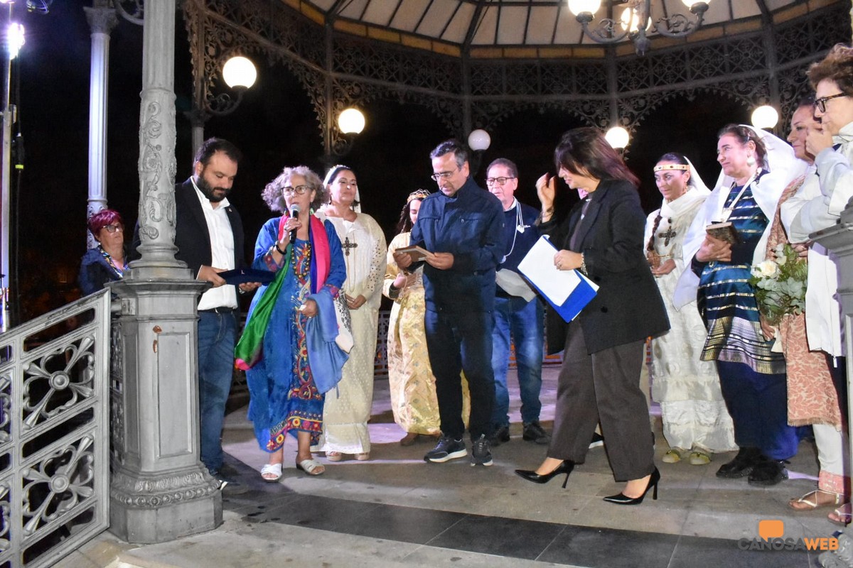 Sulla cassa Armonica di Piazza Garibaldi a Taranto, dove si è conclusa la VII Edizione della Rassegna dei Cortei Storici delle Pro Loco di Puglia, con gli interventi tra gli altri, di Rocco Lauciello, Presidente UNPLI Puglia; di Elia Marro, presidente Pro Loco Canosa, sono state narrate in sintesi le vicende storiche della "Translatio Corporis Sancti Sabini", curate da Mons. Felice Bacco, parroco della Basilica Cattedrale di San Sabino, dalla professoressa Nunzia Lansisera, docente di lettere presso il Liceo "E. Fermi" di Canosa di Puglia, mentre le vesti, nella loro completezza sono state ideate, interpretate, rielaborate e realizzate dalla professoressa Elena Di Ruvo, docente di arte, con competenze in storia e tecnica del costume. Applausi e congratulazioni da parte delle autorità e del folto pubblico presente per la Rassegna dei Cortei Storici delle Pro Loco di Puglia, che si conferma per la sua bellezza e attrazione, capace di unire la regione attraverso la storia, l'immenso valore delle tradizioni per la loro continuità nel tempo, rendendo omaggio alle proprie radici, mediante le rievocazioni di leggende e costumi che hanno segnato epoche e luoghi coinvolgendo le diverse anime culturali della regione. "Quando un corteo attraversa una piazza, non assistiamo solo a una rievocazione folklorica, ma a un teatro della memoria che unisce costumi, musiche e saperi artigianali. Ogni passo e ogni bandiera raccontano un frammento dell'anima di un popolo". Non solo un'occasione di esibizione e incontro, la rassegna dei cortei storici ha proposto momenti di condivisione e di valorizzazione del patrimonio culturale immateriale che le Pro Loco di Puglia custodiscono e tramandano di generazione in generazione negli anni.