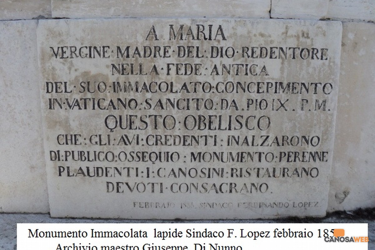 "Sono stati dati alle stampe nel settembre del 2025 gli Atti del 45° Convegno nazionale di Storia della Daunia, tenutosi a San Severo il 16 e 17 novembre del 2024.- Riferisce il Professore Christian De Letteriis, autore dello studio nelle pagine 146-148. Il volume contiene il saggio del professor Christian de Letteriis, docente di storia dell'arte, tra i relatori del simposio, nel quale sono raccolti i risultati delle indagini archivistiche sul marmoraro napoletano Antonio Di Lucca, al vertice di una delle botteghe più attive nel settore dei marmi decorativi nel secolo XVIII. Fra i documenti rinvenuti e pubblicati dallo studioso vi è quello relativo alle colonne della Immacolata Concezione e della gogna di Canosa, che oggi "sappiamo essere state elevate nel 1765 su commissione del principe Antonio Capece Minutolo." Un contributo importante del professor De Letteriis , per conoscere un'altra pagina poco nota della storia della Città di Canosa di Puglia. Continua la devozione e la custodia e promozione del monumento dell'Immacolata, facendo memoria, come scrive il Maestro Di Nunno, dei quattro lumi a petrolio che "per antica divozione a Maria Santissima si alluminano da devoti ogni sera".