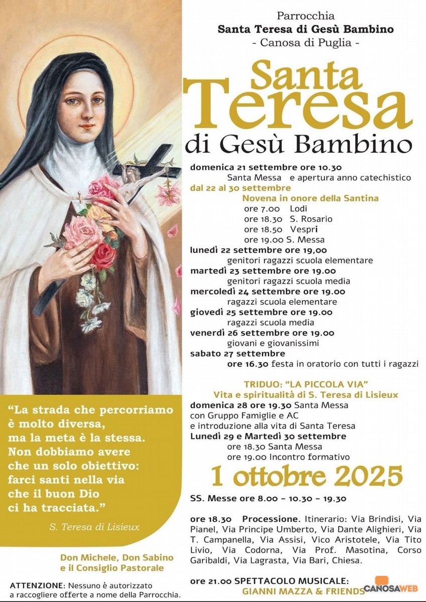 Il primo ottobre, la comunità parrocchiale di S. Teresa di Gesù Bambino di Canosa di Puglia festeggia la sua santina in una atmosfera di spiritualità, ma nello stesso tempo di fraternità, convivialità dove tutti sono invitati al banchetto dell'Amore di Cristo, l'Eucarestia di cui siamo i suoi commensali prediletti, senza alcuna misura e distinzioni, con la nostra fragilità, con i nostri piccoli sforzi. L'emblema di tale cammino è la nostra "Santina", la quale, pur nella consapevolezza totale della "sua piccolezza", non si è arresa, ma ha speso la sua vita in un cammino di "santità", sintesi di amore, dono, servizio, sofferenza e piccolezza di fronte allo sconfinato amore di Cristo per ciascuno di noi. La Santina, ancora oggi, a centocinquantadue anni dalla sua nascita, avvenuta nel 1873, non smette di interpellarci, tutti la riconoscono come Suor Teresa del Bambin Gesù e del Volto Santo, la più grande santa dei tempi moderni secondo il papa Pio x. Infatti nel 1997 nella lettera apostolica "Divini amori scentia", che accompagnava la sua proclamazione a Dottore della Chiesa – la più giovane e la terza donna insieme a Caterina da Siena e Teresa d'Avila – Giovanni Paolo II scrisse: "Teresa è stata illuminata in maniera particolare sulla realtà del Corpo mistico di Gesù, sulla varietà dei suoi carismi, doni dello Spirito Santo, sulla forza della carità, che è come il cuore stesso della Chiesa". In tale contesto è comprensibile come eminenti studiosi cattolici (Jean Guitton, Edith Stein) siano stati motivati ad esplorare il suo pensiero per la sua profonda carità rivolta verso coloro che erano esclusi dall'amore.